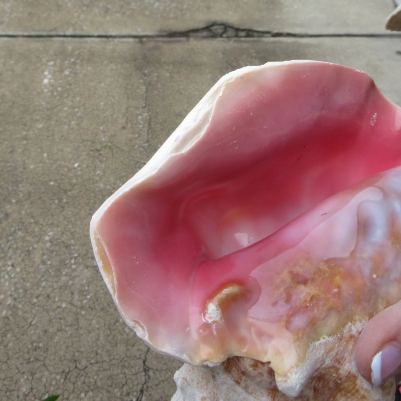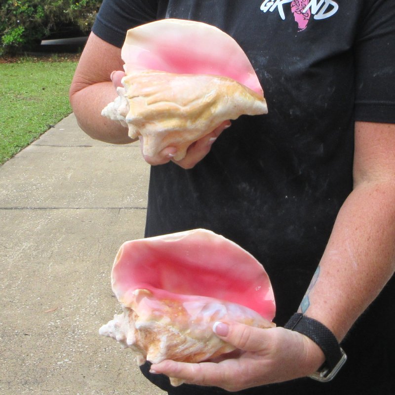 Two pink conch shells for sale (Strombus gigas), large shells for decorating. Measuring approximately 7 inches long each. These conchs will have a slit in the back of the shell, done to quickly remove the meat.  The lips have been machine edged.   These are nice shells, but are NOT perfect. They will have natural imperfections such as; chipped or broken points, holes, worm holes or pock marks, calcium build-up, chipped edges, etc., from living in the oceans and aging. - Chips and build up on shells. Review all photos. Pink conchs are found in Southeast Florida, Bermuda and the West Indies. Pink conch shells are great for display in your home or around a pool area or in a garden.