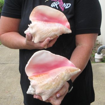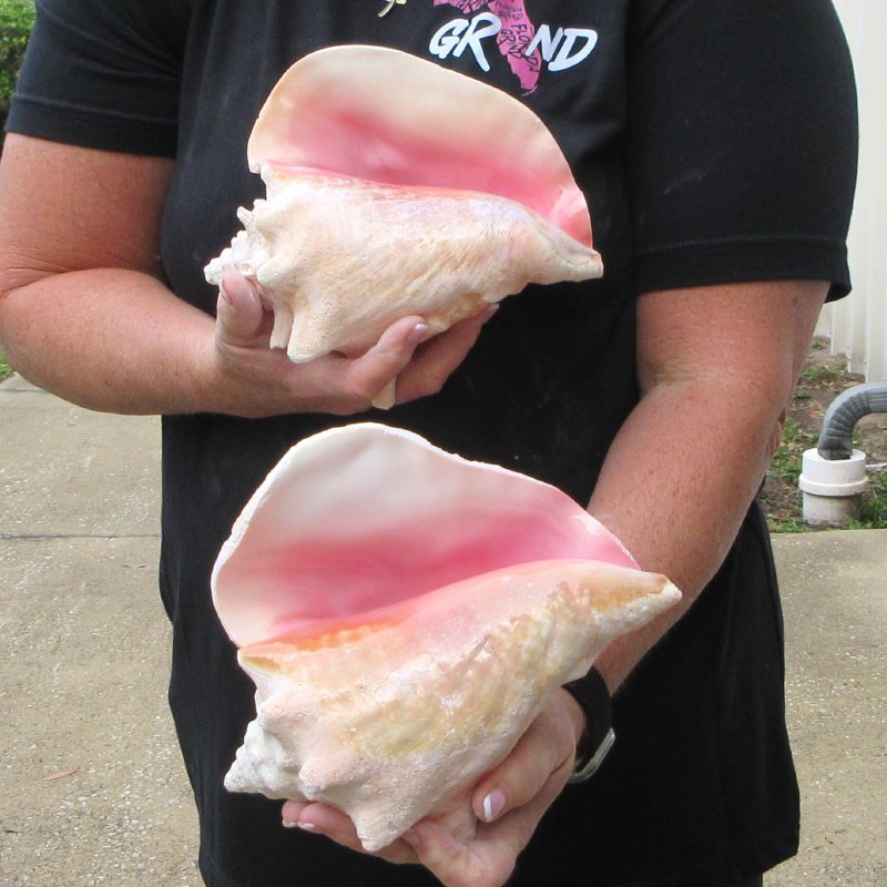Two pink conch shells for sale (Strombus gigas), large shells for decorating. Measuring approximately 8 and 8-1/2 inches long each. These conchs will have a slit in the back of the shell, done to quickly remove the meat.  The lips have been machine edged.   These are nice shells, but are NOT perfect. They will have natural imperfections such as; chipped or broken points, holes, worm holes or pock marks, calcium build-up, chipped edges, etc., from living in the oceans and aging. -  Review all photos. Pink conchs are found in Southeast Florida, Bermuda and the West Indies. Pink conch shells are great for display in your home or around a pool area or in a garden.