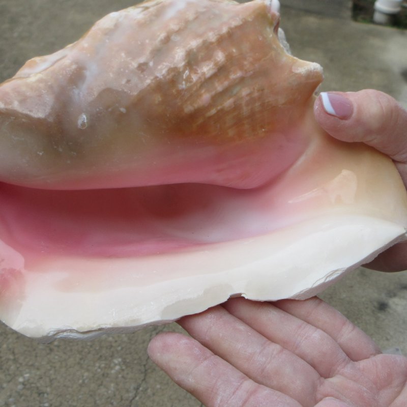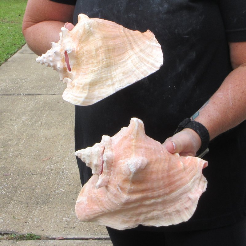 Two pink conch shells for sale (Strombus gigas), large shells for decorating. Measuring approximately 8 inches long each. These conchs will have a slit in the back of the shell, done to quickly remove the meat.  The lips have been machine edged.   These are nice shells, but are NOT perfect. They will have natural imperfections such as; chipped or broken points, holes, worm holes or pock marks, calcium build-up, chipped edges, etc., from living in the oceans and aging. - Chips on shell. Review all photos. Pink conchs are found in Southeast Florida, Bermuda and the West Indies. Pink conch shells are great for display in your home or around a pool area or in a garden.