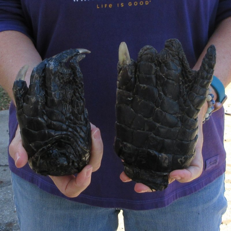 2 Piece Lot of Preserved Alligator Feet, measuring approximately 6 inches in length. The ends of the foot have been rough cut and painted black.  Review all photos. This alligator foot will have an odor from the preservation process that will subside over time. This is a Real Gator Foot - Not a Replica. It will have natural imperfections. These alligator feet come from gator farms where the gators are harvested for their meat and hide.