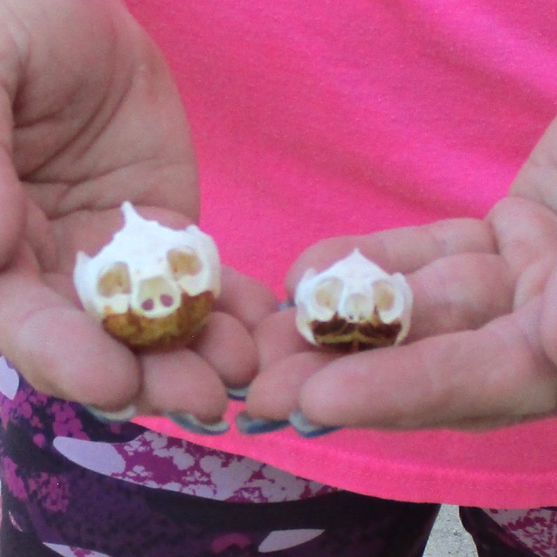 Two red eared slider turtle skulls (Trachemys scripta elegans), measuring approximately 1-3/4 inch long by 1-1/4 inch wide and 1-1/4 inch long by 3/4 inch wide.