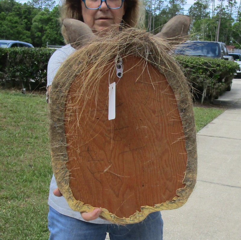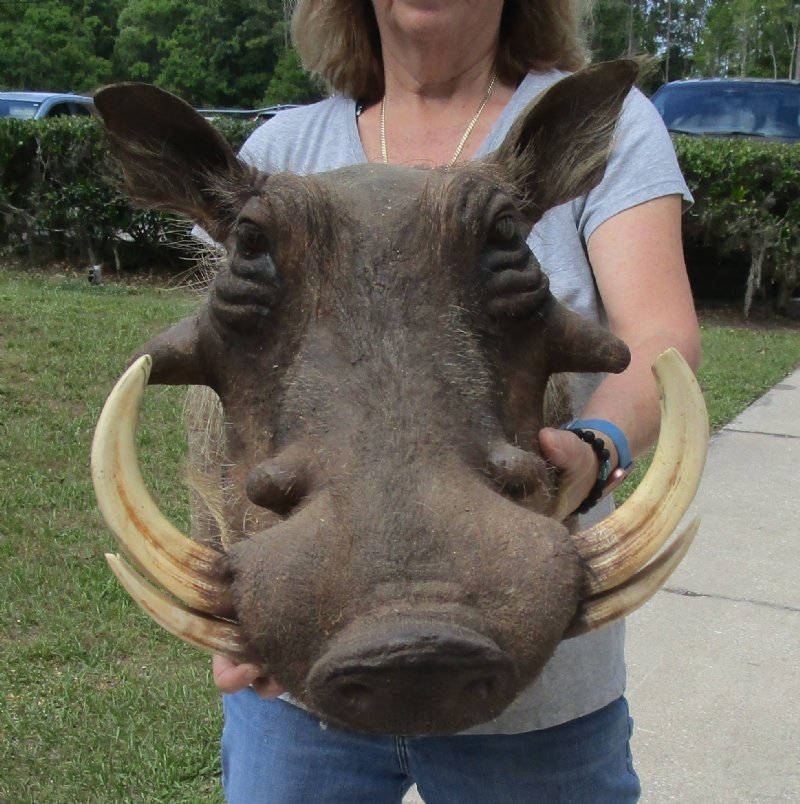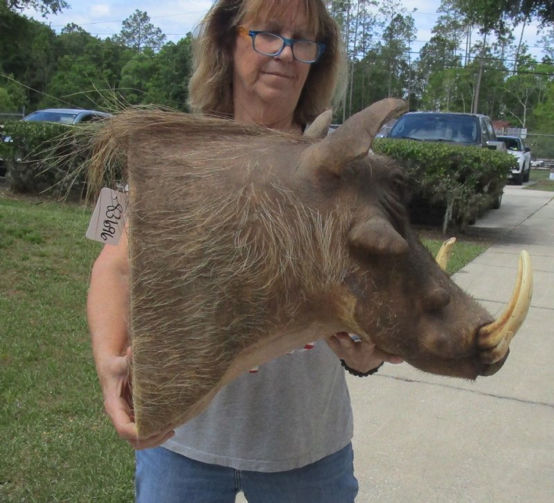 Warthog Shoulder Mount for sale with tusk measuring approximately 7 to 8 inches. The Warthog is a tough, sturdy animal.  Males weigh 9 to 23 kilograms (20 to 50 pounds) more than females, but both are distinguished by disproportionately large heads and "warts" - thick protective pads that appear on both sides of the head.  Although they can excavate, warthogs normally use holes dug by other animals, like aardvarks.  They sleep and rest in holes.  The shelter holes provide is important for their thermoregulation - having neither fur nor fat, this species lacks both protection from the sun and insulation from the cold.  Sometimes, they will fill the holes with grass for warmth.   This Warthog shoulder mount has be mounted by a professional taxidermist.