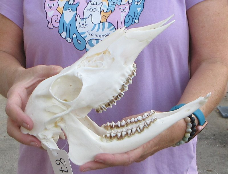 This is a Whitetail deer (doe) skull with bottom jaw measuring approximately 11 inches long.   This  whitetail deer skull is ready for display and is perfect for skull collectors and collectors of weird and unusual items. All of our taxidermy items are commercial grade and imperfect. They will have imperfections due to the natural aging process and living in the wild--scars, blemishes, rub areas, broken teeth, bug bite marks, etc.
