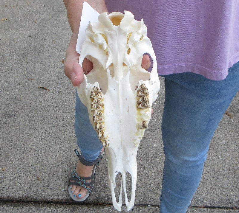 This is a Whitetail deer (doe) top skull measuring approximately 10 inches long.   This  whitetail deer top skull is ready for display and is perfect for skull collectors and collectors of weird and unusual items. All of our taxidermy items are commercial grade and imperfect. They will have imperfections due to the natural aging process and living in the wild--scars, blemishes, rub areas, broken teeth, bug bite marks, etc.