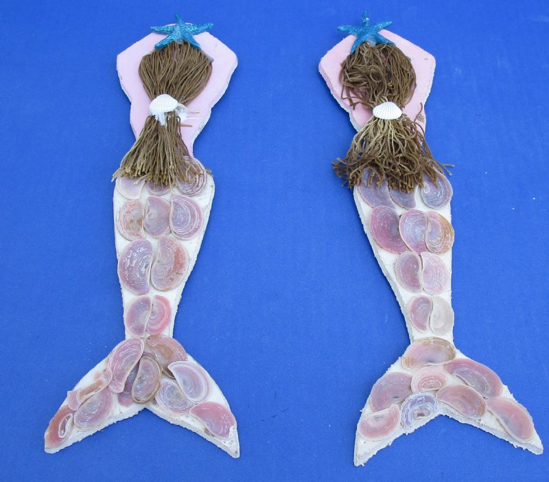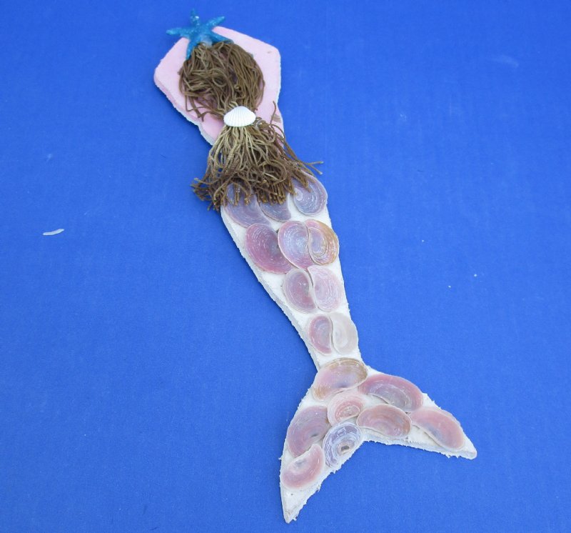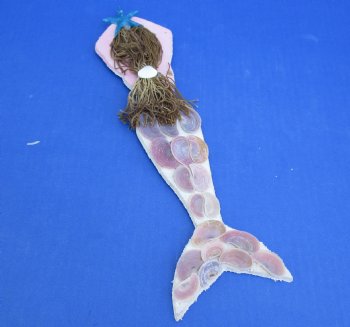 Wholesale Seashell Mermaid Wall plaque with a hanger on the back measuring approximately 12 inches long and 3-1/2 inches wide.  This seashell mermaid is covered with pink operculum shells a blue starfish and brown twine for the hair.   Perfect for decorating a guest room, patio, deck, bathroom or any room with a nautical decor.