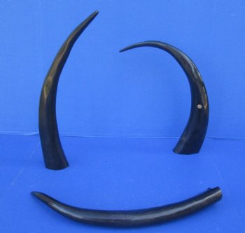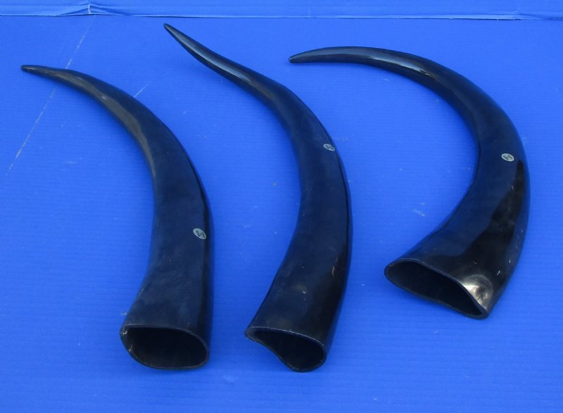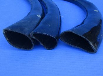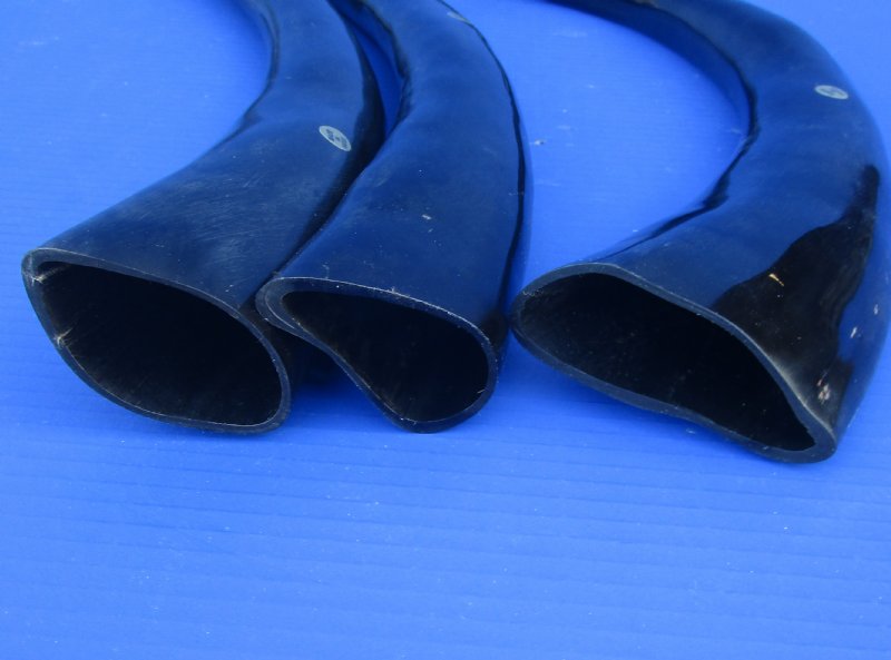 Polished Water buffalo horns wholesale 21 inches to 24 inches are measured around the curve of the horn using a cloth tape measure -- NOT straight with a wood ruler.. Polished water buffalo horns are used for making animal horn jewelry, in cabin decor, rustic decorating, in making knife and cane handles, for carving, in the art of scrimshaw and in making inlaid instruments.