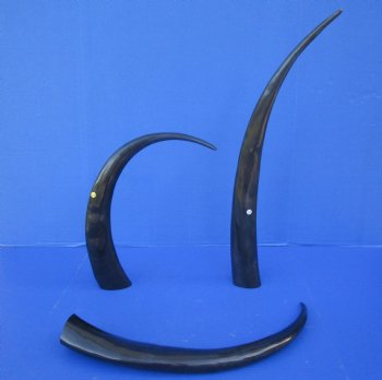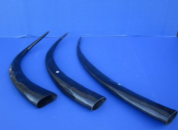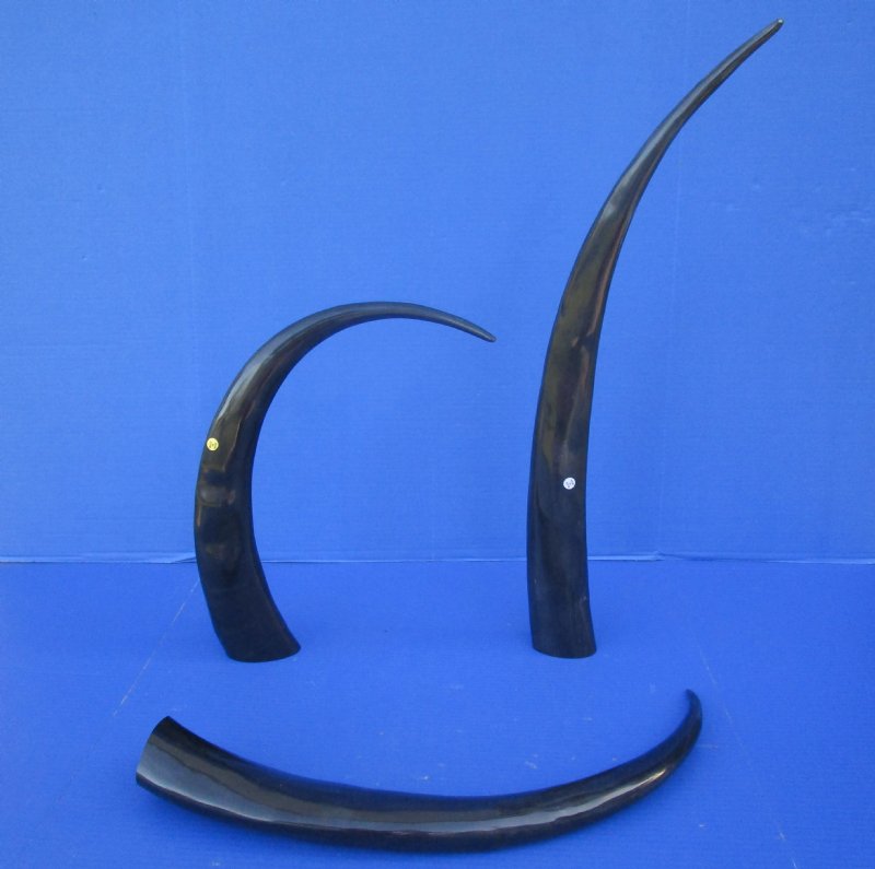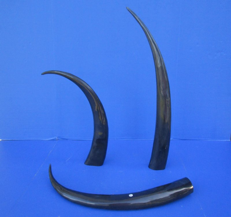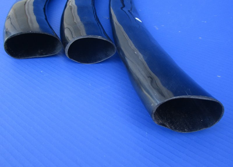 Polished Water buffalo horns wholesale 25 inches to 29 inches are measured around the curve of the horn using a cloth tape measure -- NOT straight with a wood ruler.. Polished water buffalo horns are used for making animal horn jewelry, in cabin decor, rustic decorating, in making knife and cane handles, for carving, in the art of scrimshaw and in making inlaid instruments.