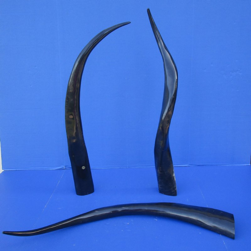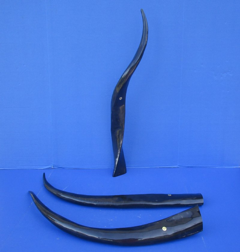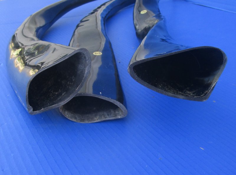 Polished Water buffalo horns wholesale 30 inches to 34 inches are measured around the curve of the horn using a cloth tape measure -- NOT straight with a wood ruler. Polished water buffalo horns are used for making animal horn jewelry, in cabin decor, rustic decorating, in making knife and cane handles, for carving, in the art of scrimshaw and in making inlaid instruments.