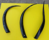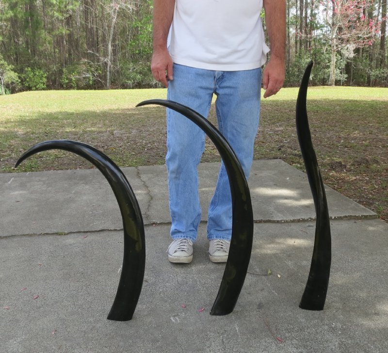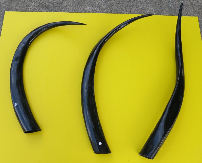 You will receive horns similiar to those shown in the photo. No two horns are identical. They will vary in coloring, shading and size. These horns are measured around the curve of the horn using a cloth tape measure -- NOT straight with a wood ruler. Some of these horns have a tiny patch at the tip of the horn where a tiny hole was drilled to release the pressure and allow removal of the inner bone.