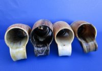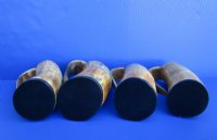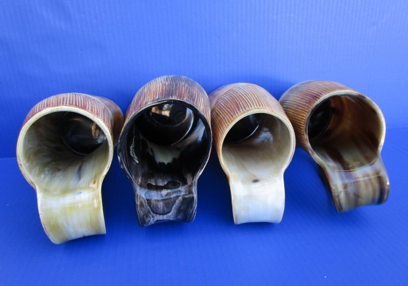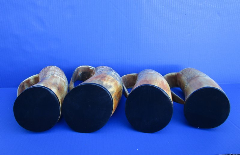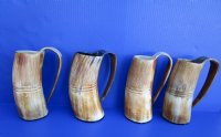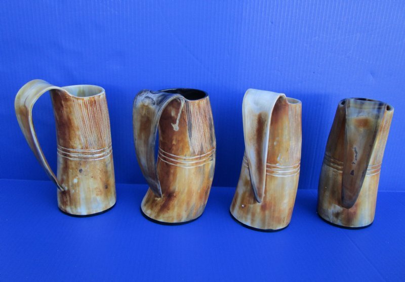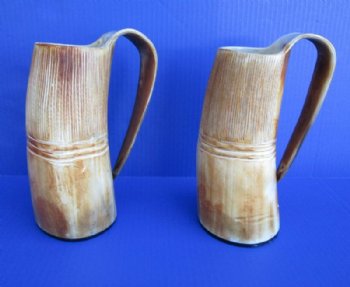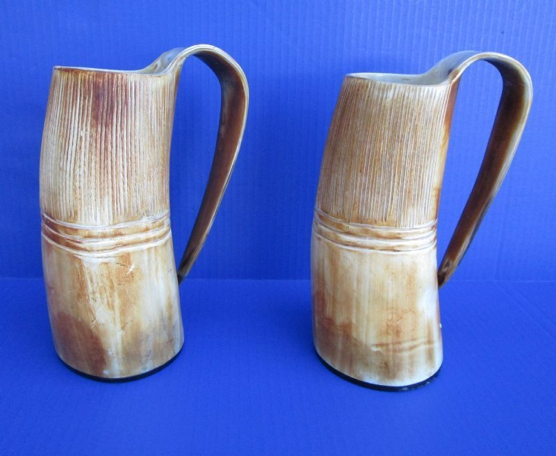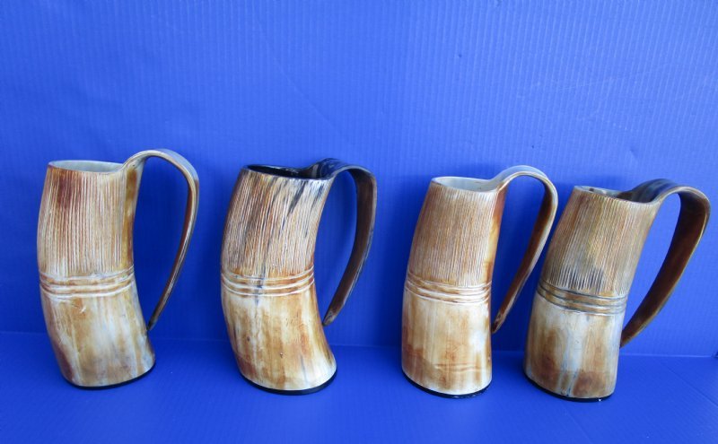 Wholesale Natural Viking medieval buffalo horn mugs having a rustic look with a golden brown color measuring approximately between 9 and 10 inches tall, measured from the base of the mug to the top of the handle. The top half is carved with vertical lines with three horizontal carved lines dividing the carved section from the bottom buffed section. These natural Viking Medieval Buffalo Horn Mugs are made using traditional methods which make an excellent re-enactment piece. The exterior has been buffed and will have a slight odor and my have minor scratches due to buffing and the natural material used. The variations in shape and color can only be made by nature: thus a horn may have natural blemishes which will not affect its use, but does verify its authenticity. DO NOT fill with hot food or beverages - the surface will be damaged. This is a natural product - Hand Wash - NOT Dishwasher Safe!