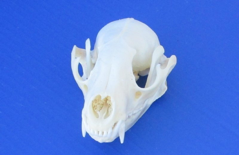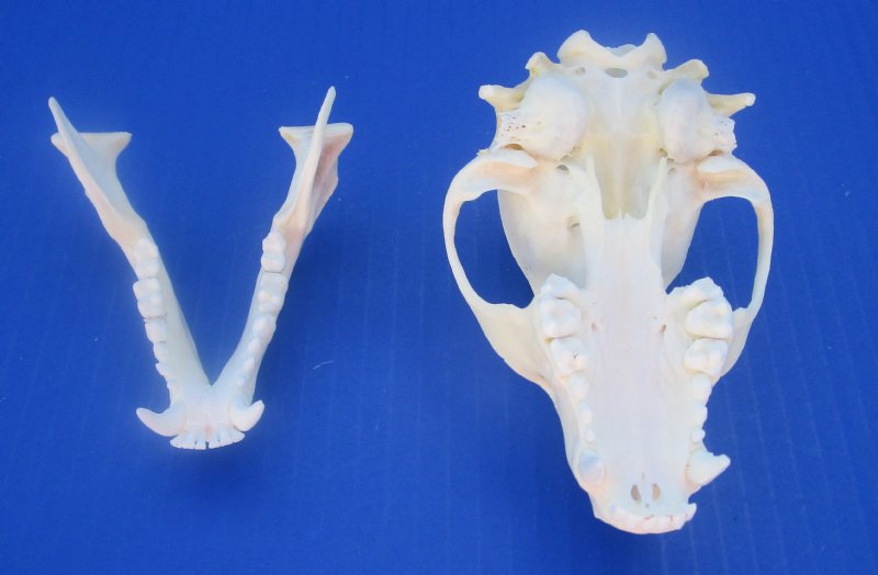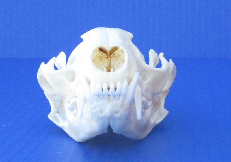 Wholesale A-grade raccoon skulls for sale measuring between approximately 4 inches long and 4-1/2 inches long.  These A-grade raccoon skulls have been beetle cleaned and whitened and will have all of their teeth and no damage.  They are from wild raccoons and will have natural imperfections and may be missing a couple teeth.  Some may have slight discoloration.
