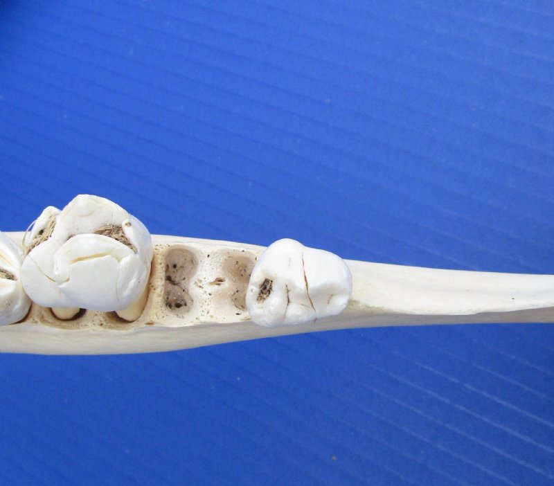 Wholesale African giraffe lower jaw bone (Giraffa camelopardalis) one side, commercial grade, measuring approximately 15 to 18 inches long.  These jaw bones will have missing teeth, glue, cracks, discoloration and brown stains on teeth - Review all photos. Giraffe jaw bones are used for carving, scrimshaw art, making bone knife handles, and for numerous other craft projects.  All products were professional cleaned and/or professionally tanned in South Africa and cleared by the U.S Fish and Wildlife Services and U.S Customs Services for legal entry into the United States.