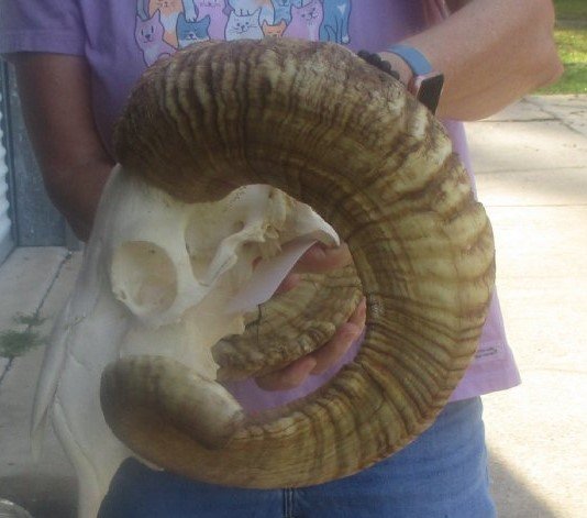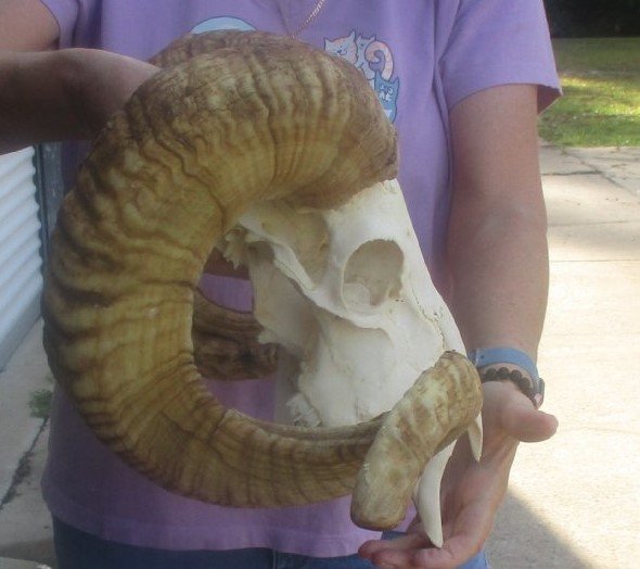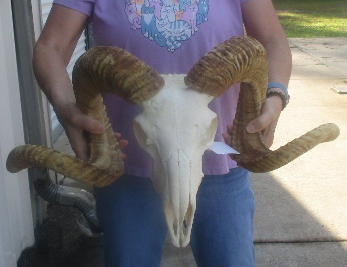 Wholesale African Merino sheep skull and horns, or ram skull and horns (Ovis aries). The horns measure approximately 18 to 29  inches, measured around the curl of the horns. These may have writing on horn, glue on nose area, discoloration, rough or damaged horn, blemishes and missing some teeth. Horns come off.  These are real sheep skulls and horns and are from the wild and will have imperfections normally found on all wild animals fighting and living in the wildThese sheep skulls and horns are ready for display and would be perfect for rustic cabin decor or log cabin decor. These sheep skull and horns, or ram skull and horns was imported from Africa and cleared for legal entry into the U.S. by the U.S. Fish and Wildlife Department and U.S. Customs Department. Our African Merino sheep skull and horns are obtained from the farming industry and the African government culling program.