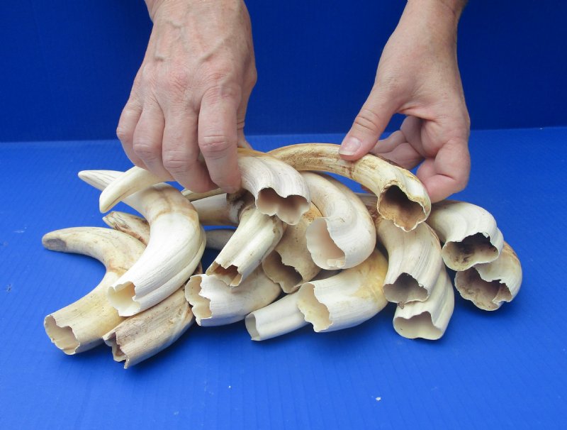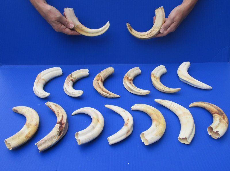 Large Wholesale African warthog tusks ranging in size from 10 inches to 10-7/8 inches imported from South Africa, measured around the curve of the tusk using a cloth tape measure - not straight!  These are good, commercial grade tusks.  Some may have tiny surface cracks and chips. Warthog ivory is used for making knife handles, carvings, making warthog handles for walking canes and for numerous taxidermy craft projects. Warthogs got their names from the bumps on their faces that look like warts. They also each have four tusks, two on each side of their snouts. The upper tusks are longer and curve toward each other. Warthogs are pigs that live in Africa south of the Sahara.