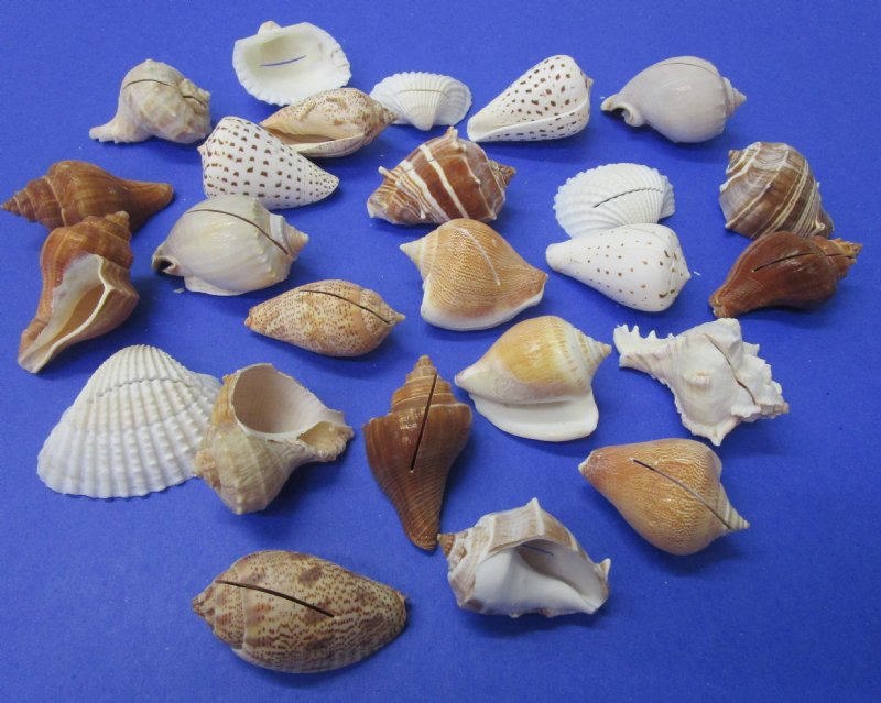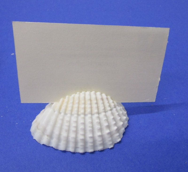 Wholesale seashell party place card holders, and beach wedding place cart holders comes in an assortment of shells.  These seashell place card holders measure between approximately 2-1/4 and 2-3/4 inches. The shell card holder is hand crafted out of real sea shells.  The assortment may include cardiums, cones, conchs, bonnets, murex, vole, canariums and other shells.