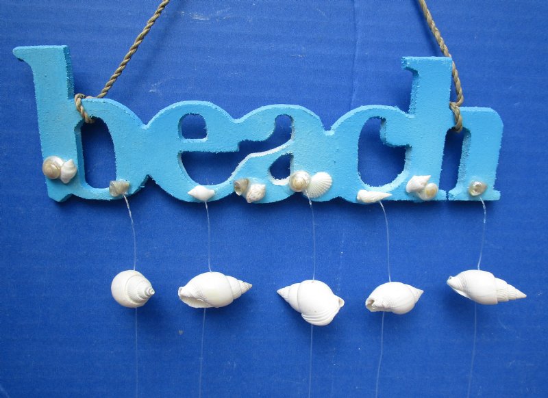 Wholesale Assorted white shells wall hanger, wall decor with a faux wood strip "Beach" sign across the top with rope for easy hanging. This wall hanger measures approximately 16 inches long and 8 inches wide (from top of beach sign to bottom of shells.  They make attractive accents in a beach themed bathroom or bedroom.