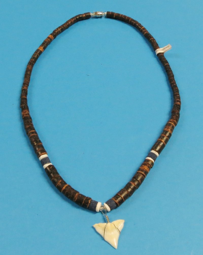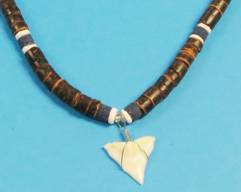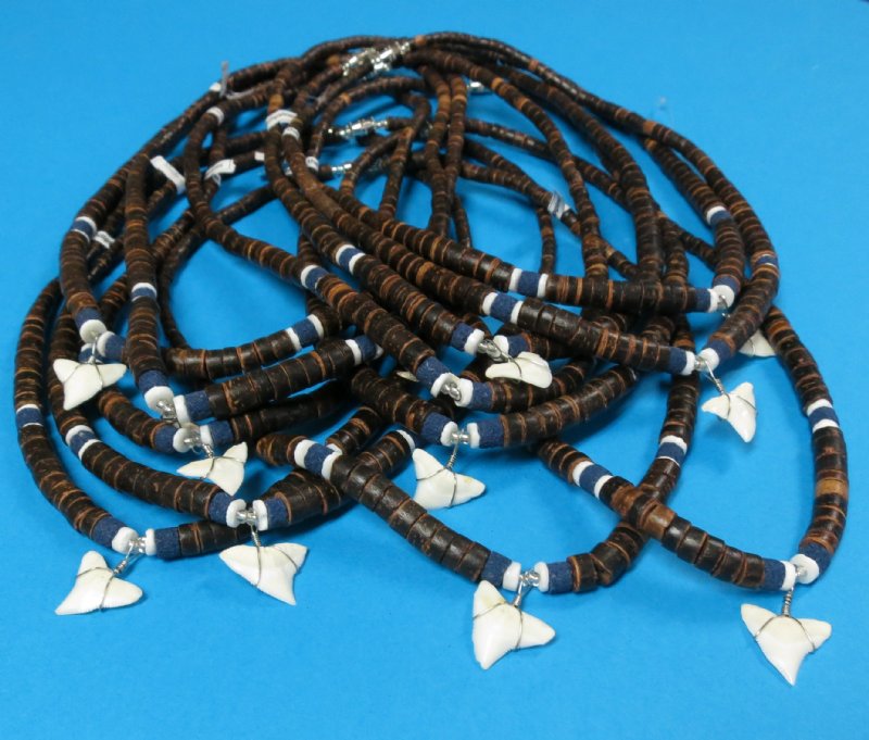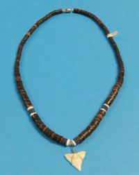 Wholesale shark tooth necklaces with brown coconut beads accented with blue beads and a shark tooth pendant.  These shark tooth pendants on brown coconut beads necklaces measure 18 inches in length.  Shark tooth necklaces strung with brown coconut beads are perfect for coastal gift shops.