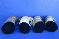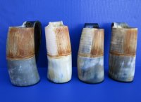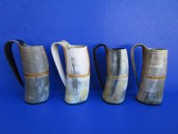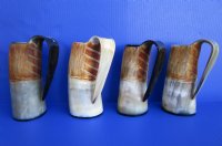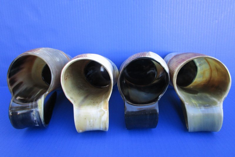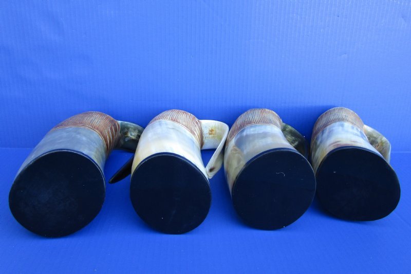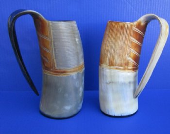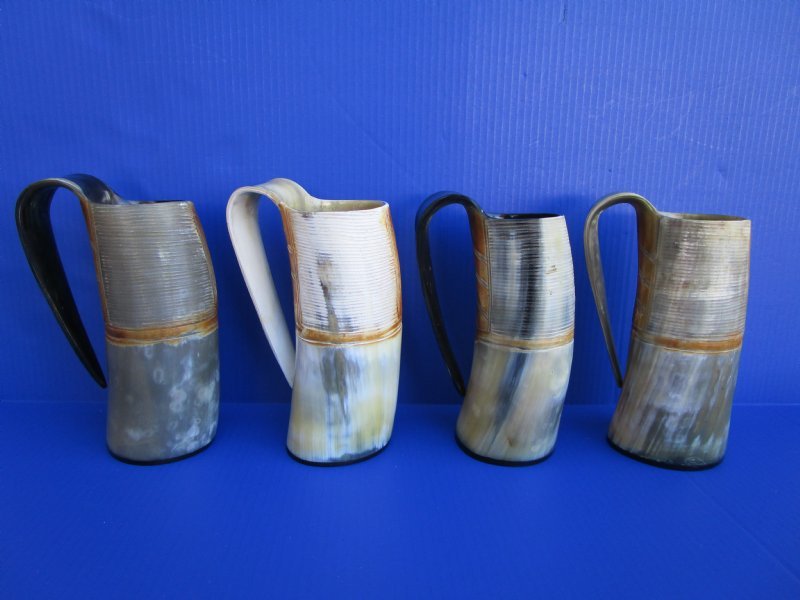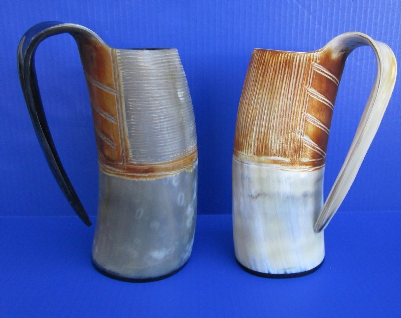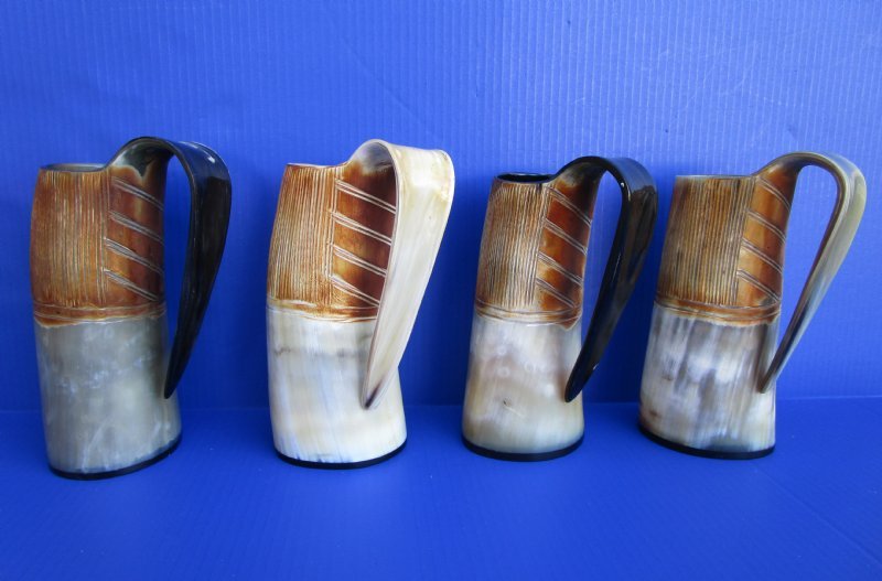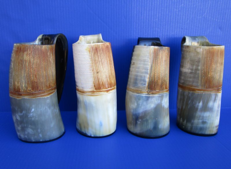 Wholesale Natural Viking medieval buffalo horn mugs, with top half carved in vertical lines and the bottom half is polished. These horn drinking mugs are made out of authentic water buffalo horn and measure between 9 inches and 10 inches tall, measured from the base of the mug to the top of the handle. These natural buffalo horn mugs are made using traditional methods which make an excellent re-enactment piece. The exterior has been hand polished and not recommend drinking from them. This item will have a slight odor and may have minor scratches due to buffing and the natural material used. The variations in shape and color can only be made by nature: thus a horn may have natural blemishes which will not affect its use, but does verify its authenticity. DO NOT fill with hot food or beverages - the surface will be damaged. This is a natural product - Hand Wash - NOT Dishwasher Safe!