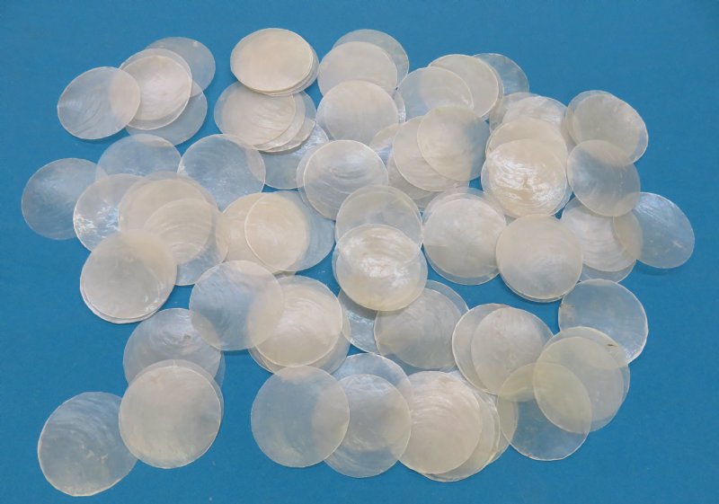 Wholesale Capiz Shells in bulk 2-1/2 inches pearlized flat shells - 500 pcs @ $.14 each