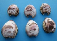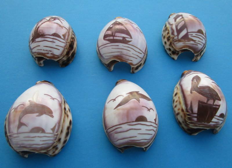 Wholesale cut purple top tiger cowrie shells, carved with various scenery are cut for making seashell night lights. The cut tiger cowries are carved with palm trees, seashorses, angel fish, pelicans ,lighthouses, dolphins, and sailing sailboats (See photos for samples of styles) Whether you are looking for seashell bathroom decor or seashell gifts, making seashell night lights are an easy and inexpensive way to add seashell decor to any room of the house and are an attractive accent in coastal home decorating.   Carved cowrie seashell night lights made out of cut cowrie shells are also great for guest rooms, bedrooms, kitchens and for seashell gifts.