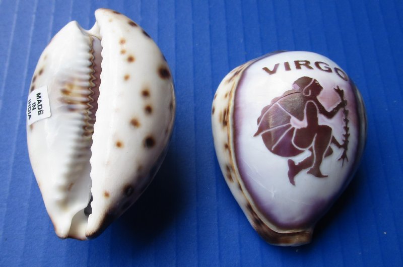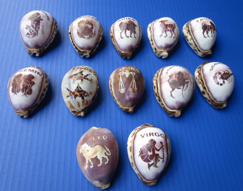 Wholesale Carved Purple top Tiger Cowries carved with each month's zodiac sign. These Carved zodiac cowrie shells measure approximately 2-1/2 to 3 inches long and will include one carved zodiac tiger cowrie with zodiac signs for January thru December.