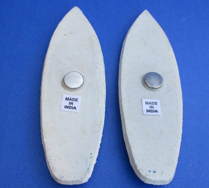 Wholesale Daytime Beach Scene Surf board magnet with little seashells, measuring approximately 4 inches.  These surf board magnets are made out of a faux wood material.  These are great souvenir gifts and are cute novelty item collected by people of all ages.  These souvenir gifts are a profitable item for beach gift shops.