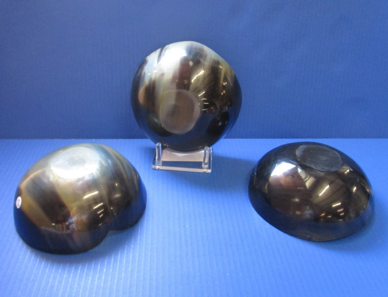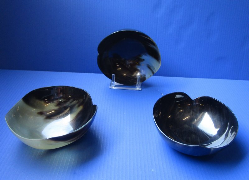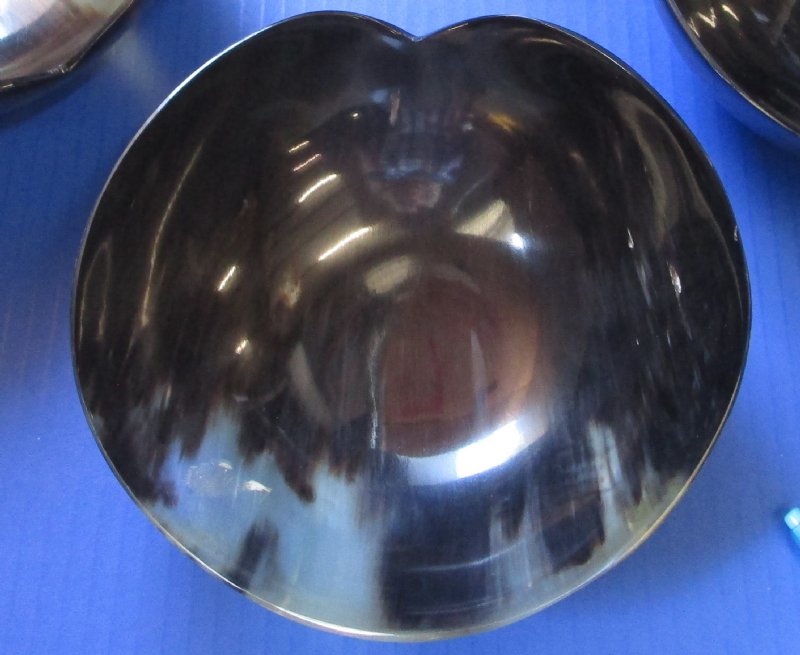 Wholesale Decorative Heart Shaped Buffalo Horn Bowls for sale measuring approximately 6 inches long, 6 inches wide and 2-1/4 inches deep. Our buffalo horn heart shaped bowls are hand crafted out of water buffalo horns and will vary in color and weight and imported from India (plastic stand shown not included). The heart shaped horn bowls will have a slight odor and my have minor scratches due to buffing and the natural material used. There may be a reflection in the bowl (trees, sky, person taking picture, etc.) due to the polish on the bowl - View all photos. The variations in shape and color can only be made by nature; thus a horn may have natural blemishes which will not affect it use, but does verify it authenticity.