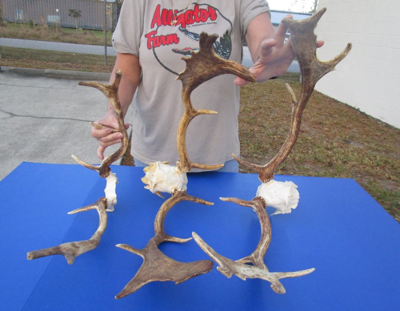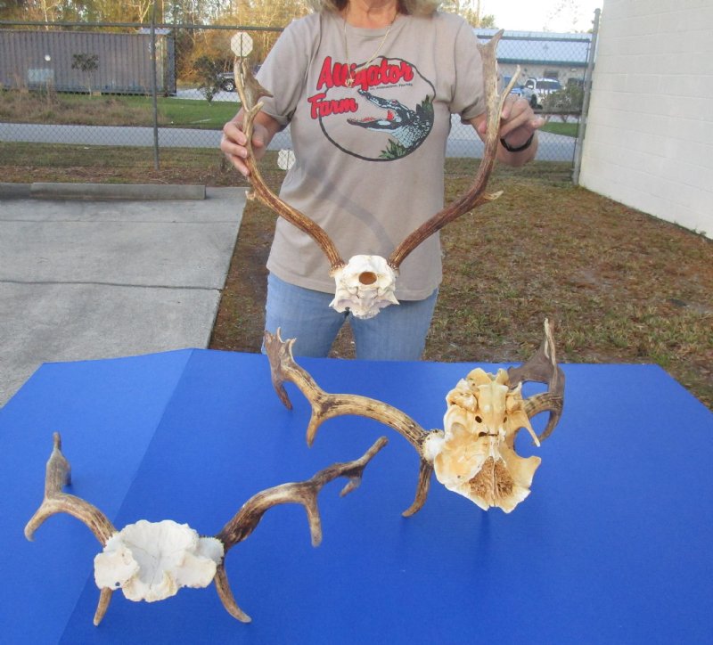 Wholesale commercial grade Fallow Deer (Dama dama) skull plate with horns (antlers) that are approximately 12 to 20 inches.  The horn height is measured from the base of the horn using a straight ruler to the longest point of the horn.  The width is measured with a ruler straight across from the left furthest tip of the horn to the right furthest tip of the horn. All our fallow deer skulls & skull plates are from wild African deer and will have natural imperfections from the natural aging process and living in the wild.  This animal was cleared by the U.S Fish and Wildlife and U.S Customs for legal entry into the U.S