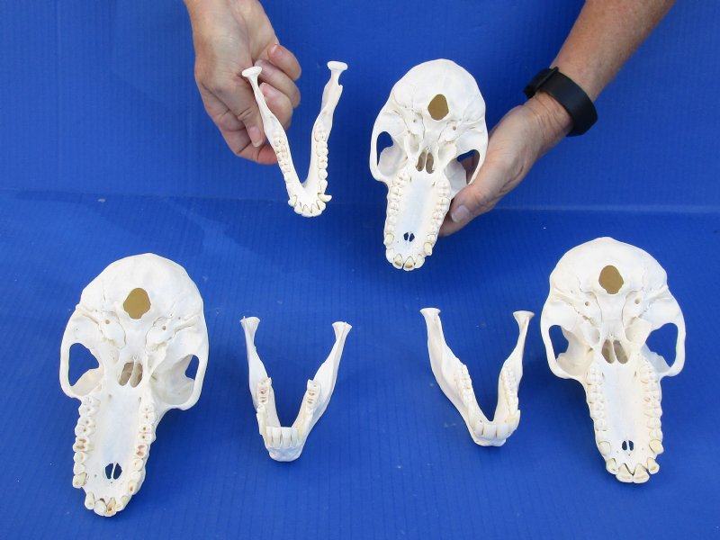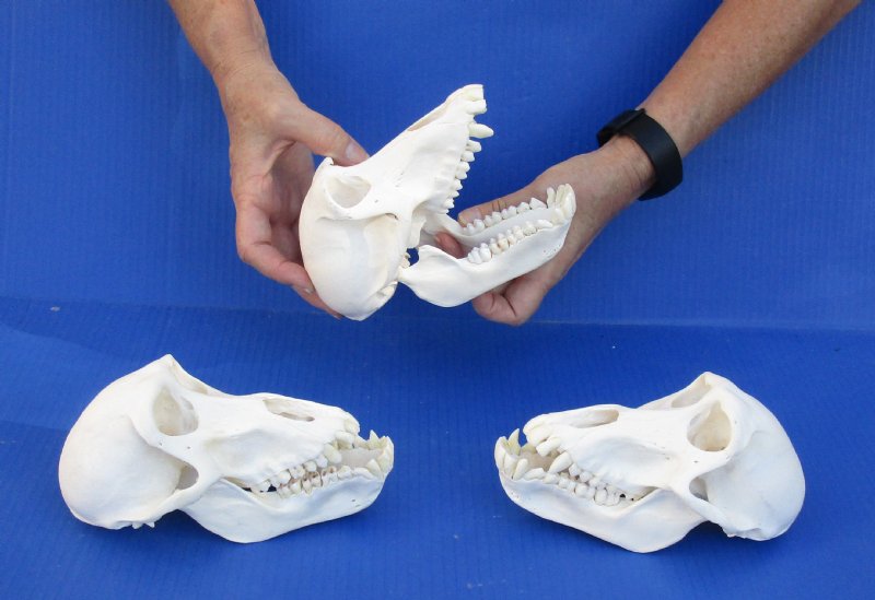 Real Female African Baboon skulls wholesale, Chacma baboon (Papio Ursinus), good quality. Our real Female Chacma Baboon skulls measure between 6 inches and 7 inches long by 3-1/2 inches and 4 inches wide and are imported from South Africa. Review all photos.  You will receive skulls that look similar to those pictured. These are good quality skulls.  They will have imperfections due to the natural aging process and living in the wild--scars, blemishes, rub areas, broken/missing teeth, discoloration, bug bite marks, etc. All of our real baboon skulls were harvested and cleaned in South Africa and imported into the United States under a Cites permit.