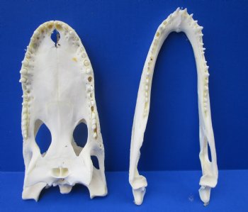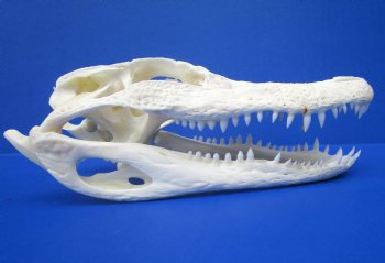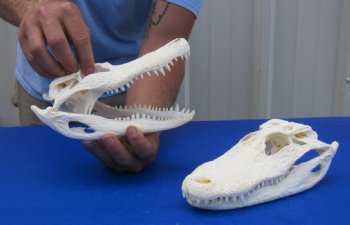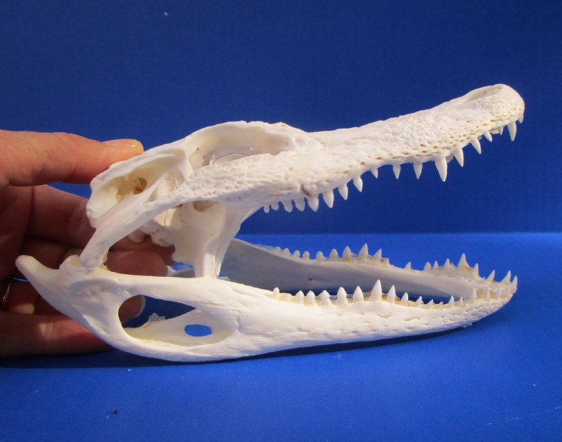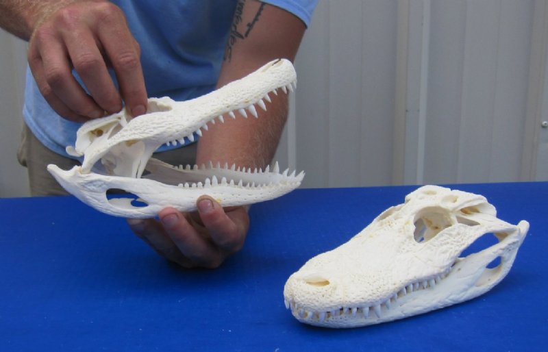 Florida Alligator Skulls Wholesale measuring between 7 and 8 inches long and are from approximately 5 foot to 6 foot long gators.  The Alligator Skull has been cleaned and whitened. These are from real gators and will have natural imperfections, missing/broken teeth, cuts, scratches, etc   The cleaning process causing the alligator's teeth to fall out and they have been glued back into the skull; however, they will not be the original teeth or in their original placement. Alligators have between 74 and 80 teeth in their mouth at a time. As teeth wear down they are replaced. An alligator can go through 2,000 to 3,000 teeth in a lifetime. These wholesale alligator skulls are a profitable retail product for beach shops and souvenir and gifts stores catering to gator football fans, tourists, reptile collectors, teachers, students, and collectors of unusual items.