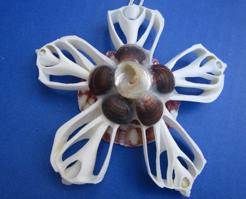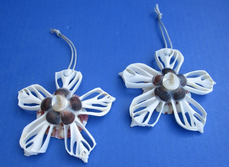 Wholesale Flower Center Cut shells for shell ornaments. These flower center cut shell are made from cut strombus shells, pecten shells, polished tiny turbo shells and brown clam shells. These ornaments are hand crafted and measure approximately 3-1/2 inches long (not counting the hanger). Seashell ornaments are popular with collectors and shell ornaments sell year-round, are easy to transport, and are an inexpensive gift your customers can give to co-workers, neighbors, family, and friends. Whether you have a beach shops, Christmas shop or  souvenir and gift shop our shell ornaments will be an item you cannot be without.