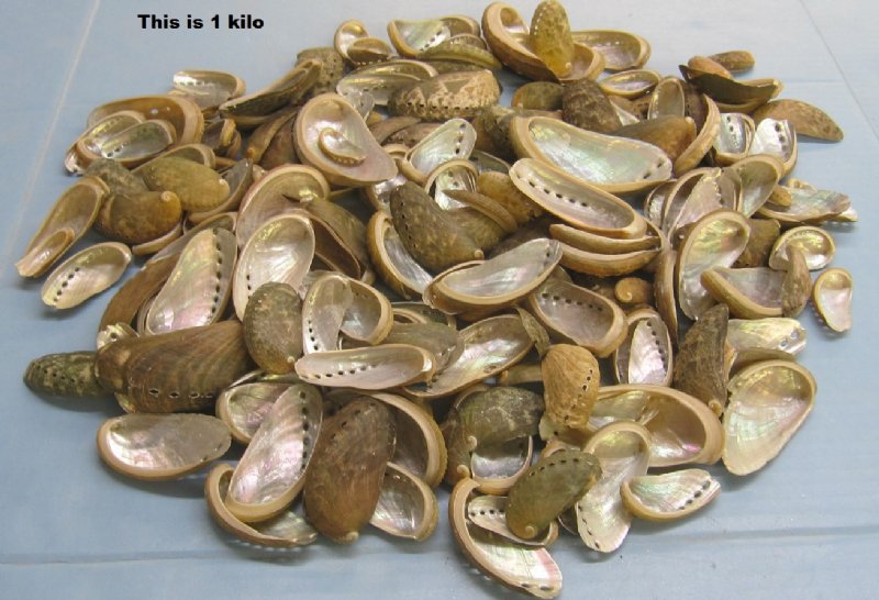 Abalone shells wholesale, commercial grade, sold by the kilo.  These green donkey's ear abalone, Haliotis asinina, measure approximately 2 inch to 3-1/4 inches in size.  These donkey ear abalones are used as craft shells in making shell flowers, as wings in angel ornaments, as borders in shell mirrors, as green shell accents in makings shell wreaths, shell characters, shell dolls, sails on shell boats and in shell candles.  The abalones, seas ears or ormers have low flatish, spiral shells with an iridescent interior and with small holes for exhaling water.  There are about 70 living species, most living on rocks in shallow wter.  The foot is edible and marketed in many countries.
