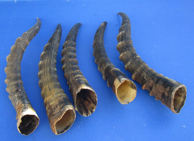 Wholesale Male Blesbok horns, Damaliscus pygargus phillipsi, commercial grade, from wild and farmed African Blesbok measure between approximately 12 inches and 16 inches measured around the curve of the horns -- not straight with a wood ruler. Blesbuck horns, or blesbok horns wholesale are used in making furniture, cane handles and in numerous taxidermy crafts.  These are real animal horns, NOT replicas. The blesbok horns will have a few natural imperfections from living in the wild: cuts, scrapes, rub areas, blemishes, scars and other natural imperfections.