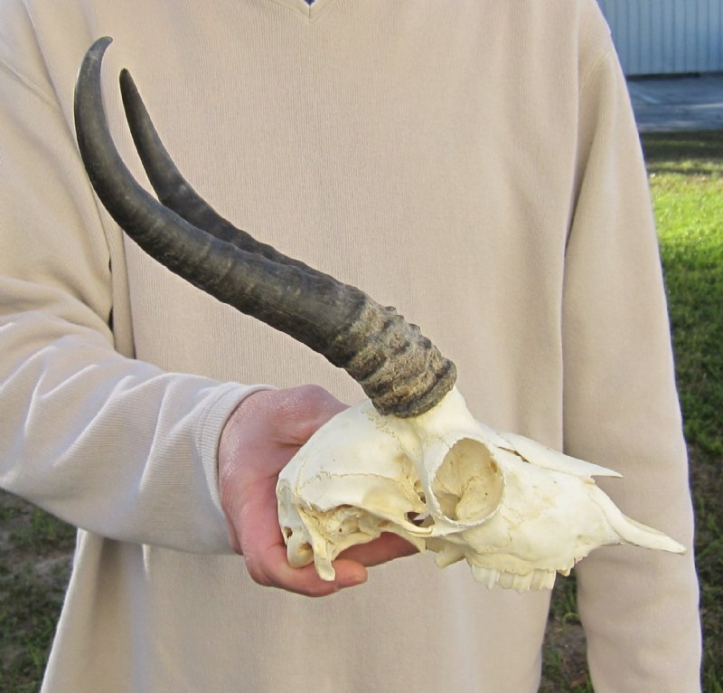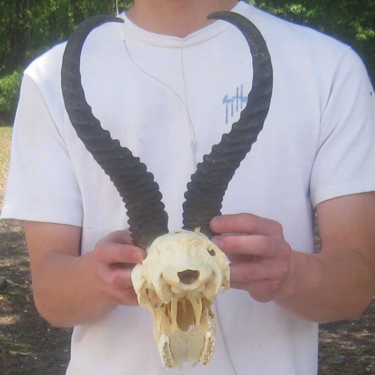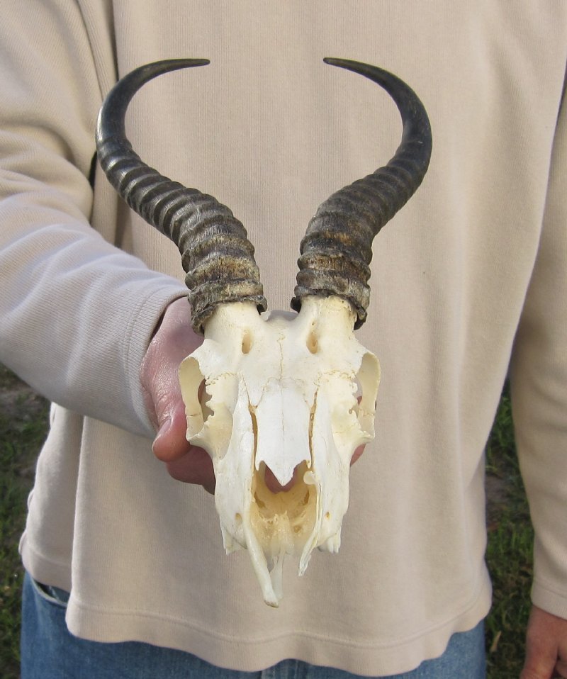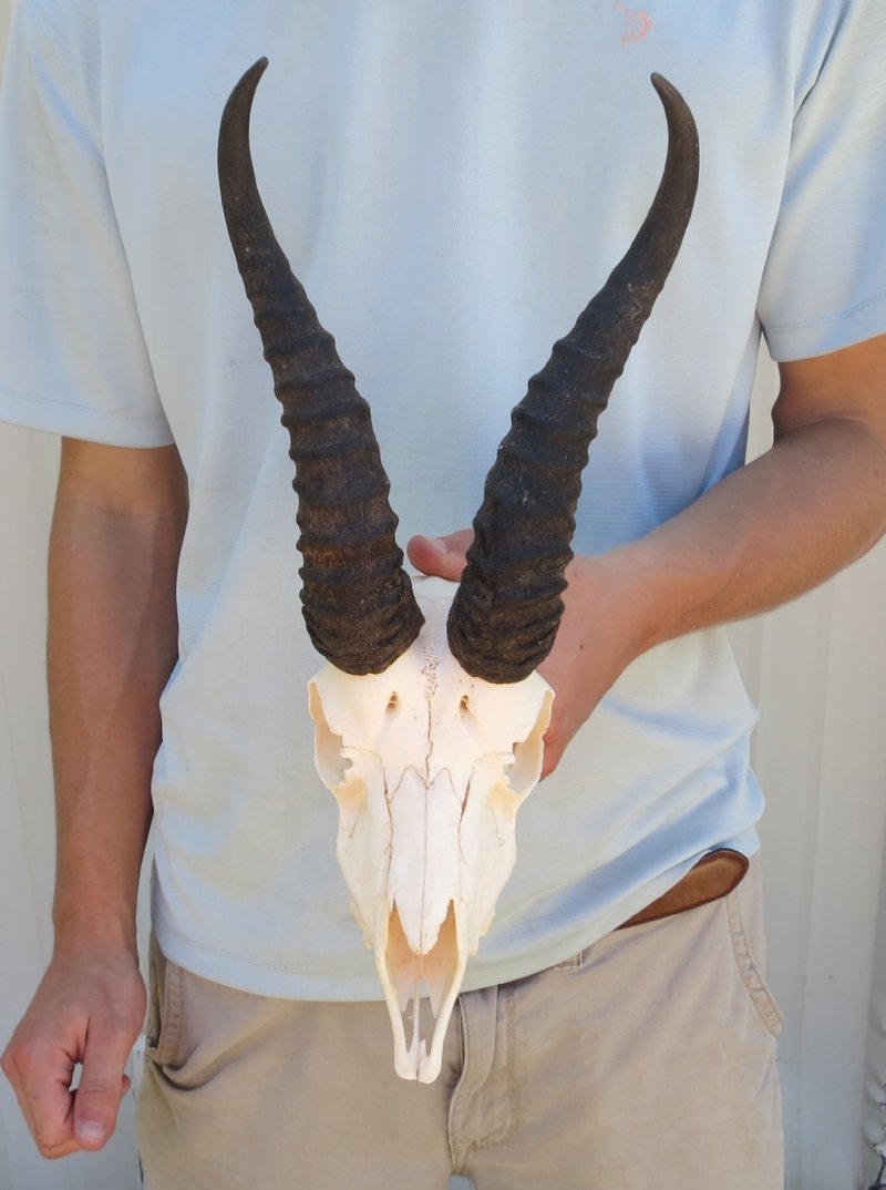 Wholesale male springbok skulls and horns of commercial grade quality with natural imperfections. The male springbok skulls and horns will have horns that will measure between approximately 9 inches and 12 inches measured around the curl of the horns. Male Springbok horns on springbok skulls are perfect for cabin decor, rustic decor and for decorating your hunting lodge. These male springbok horns on springbok skulls are real, NOT replicas, and will have imperfections caused by the animal living in the wild and the natural aging process --and may include small cracks, small hole in back of skull, scrapes, cuts, scars, missing teeth, blemishes, etc.