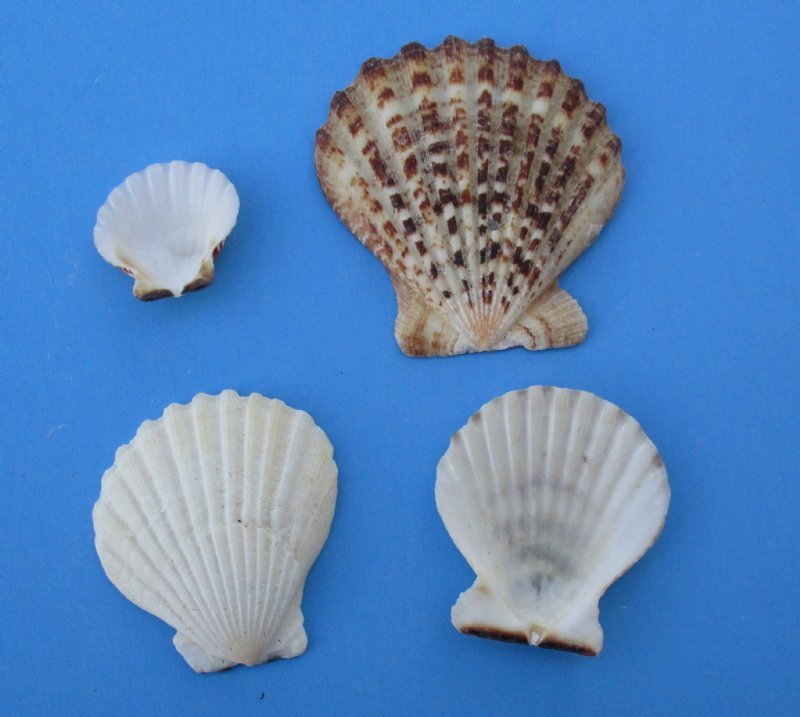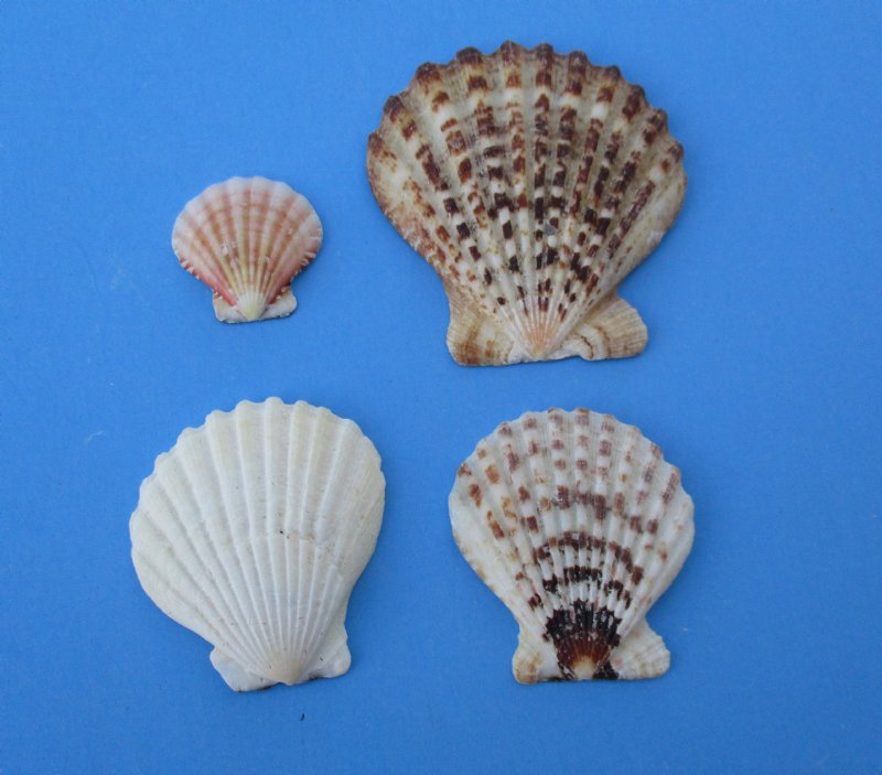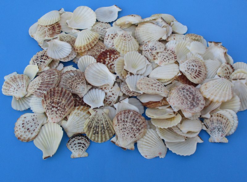 Case of wholesale Pecten Radula shells for crafts measure approximately 2 inches to 3-1/4 inches in size.  These pecten radula scallop shells are used as a base in making seashell mirrors and as filler in making shell filled lamps.  Scallop shells are used in making shell mirrors, shell ornaments, shell wreaths, making shell characters and are a popular shell for shell crafting projects.