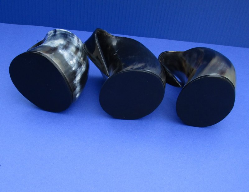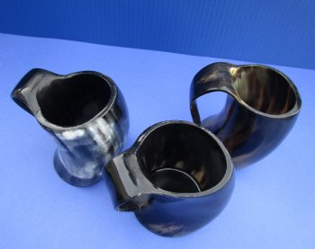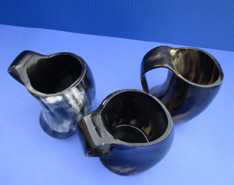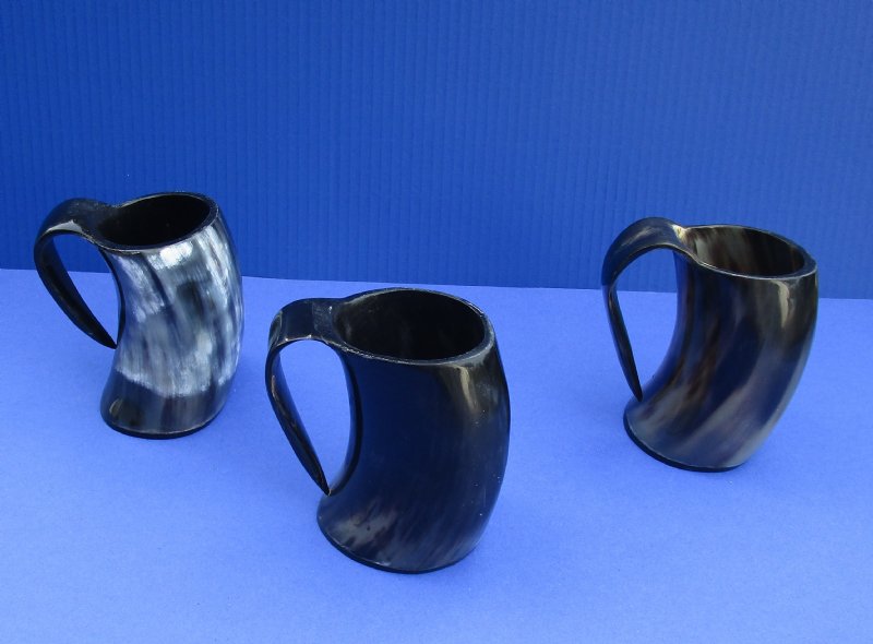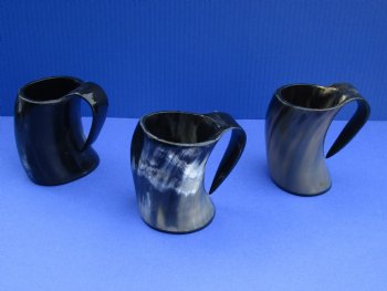 Wholesale Natural Viking medieval buffalo horn mugs with resin bottom measuring approximately 4 inches tall, measured from the base of the mug to the top of the handle. These natural buffalo horn mugs are made using traditional methods which make an excellent re-enactment piece. The exterior has been hand polished and includes a horn handle. These mugs make a beautiful display item and while they hold liquid, we do not recommend drinking from them. The item will have a slight odor and may have minor scratches due to buffing and the natural material used. The variations in shape and color can only be made by nature; thus a horn may have natural blemishes which will not affect its use, but does verify its authenticity.