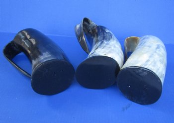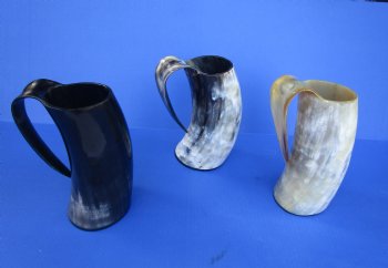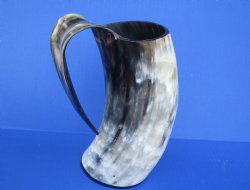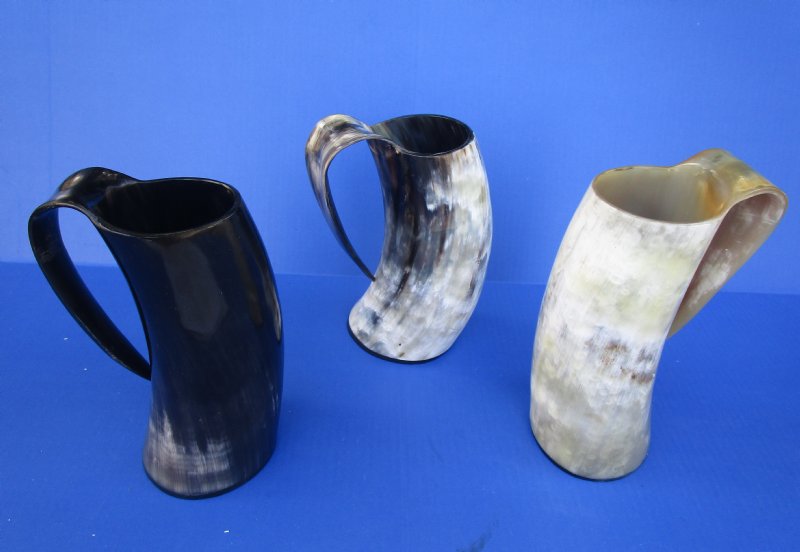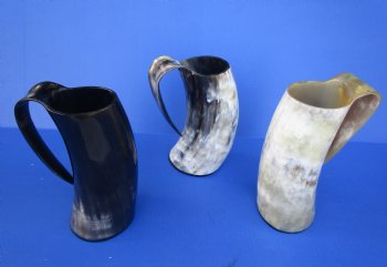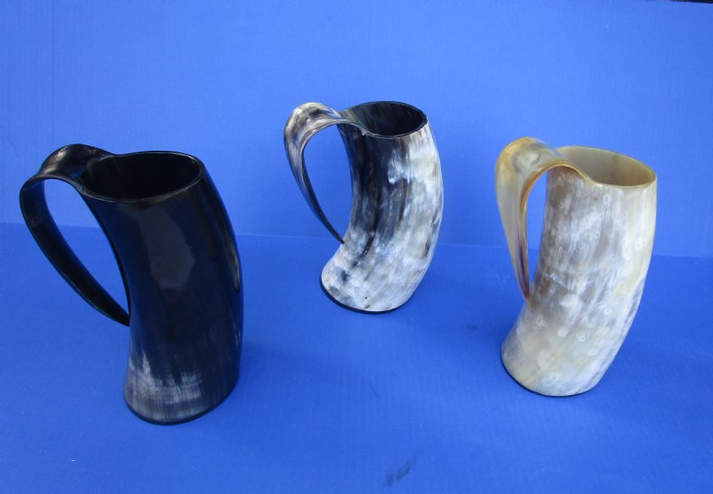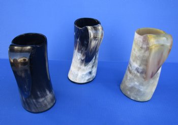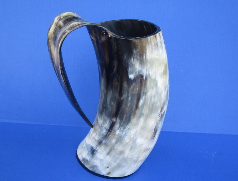 Wholesale Natural Viking medieval buffalo horn mugs measuring approximately 8 inch tall, measured from the base of the mug to the top of the handle. These natural buffalo horn mugs are made using traditional methods which make an excellent re-enactment piece. The exterior has been hand polished and includes a horn handle. These mugs make a beautiful display item and while they hold liquid, we do not recommend drinking from them. The item will have a slight odor and may have minor scratches due to buffing and the natural material used. The variations in shape and color can only be made by nature; thus a horn may have natural blemishes which will not affect its use, but does verify its authenticity.