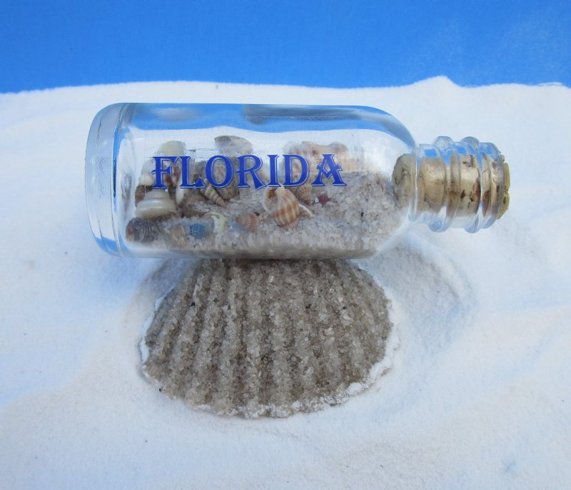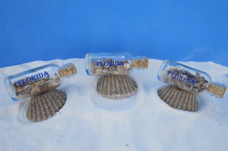 Wholesale "Florida" souvenir bottle with shells and sand on top of scallop shell made out of sand. These bottles are 3" and are filled with sand and natural shells. These are great "Florida" souvenir gifts and are cute novelty items collected by people of all ages. These "Florida" souvenir gifts are a profitable item for beach gift shops.