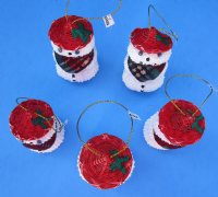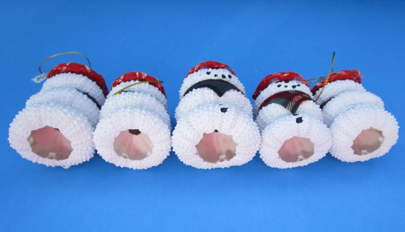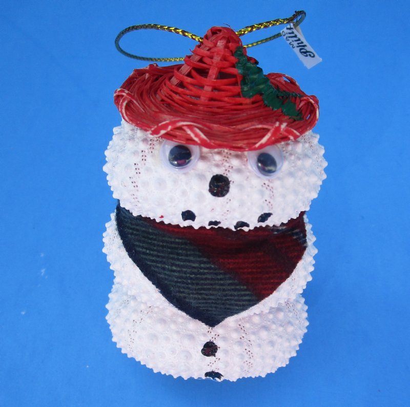 Our wholesale Sea urchin Seashell Snowman Christmas ornaments wearing a red hat and assorted design scarves are hand crafted out of natural sea urchins.  These seashell snowmen measure approximately 2-1/2" to 3" tall and 1-1/2" to 2" wide (without the hanger).   Shell snowman ornaments make an attractive addition to any beach theme Christmas tree. Seashell ornaments sell year-round, are easy to transport, and are an inexpensive gift your customers can give to co-workers, neighbors, family, and friends. Whether you have a beach shop, Christmas shop or souvenir and gift shop our shell ornaments sell year-round and are a profitable retail item.