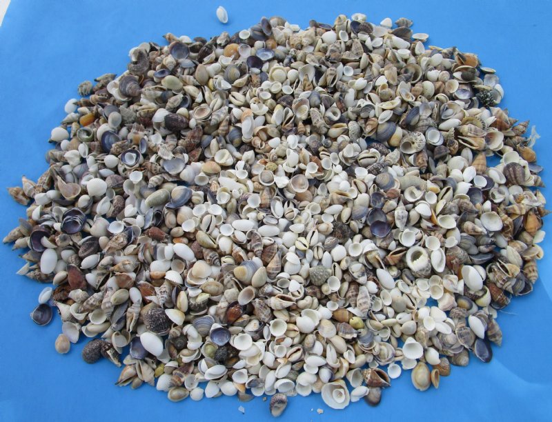 Wholesale small mixed seashells for crafts and making shell candles measures approximately 1/2 inch to 2 inch. These small mixed seashells, or small craft seashells include donax, miter shells, tiny clam shells, bubble shells, cowrie shells,nutmeg shells,  and many more tiny shells.