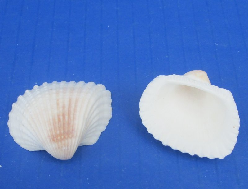 Wholesale Small White Cardium (Anadora Granosa), measuring approximately 1 to 1-1/4 inches.  Ribbed Cockle Shells for Sale are used in making shell mirrors, shell ornaments, shell wreaths, shell characters and in shell baskets. White cardium ribbed cockle shells are pretty white shells used in numerous shell craft projects.