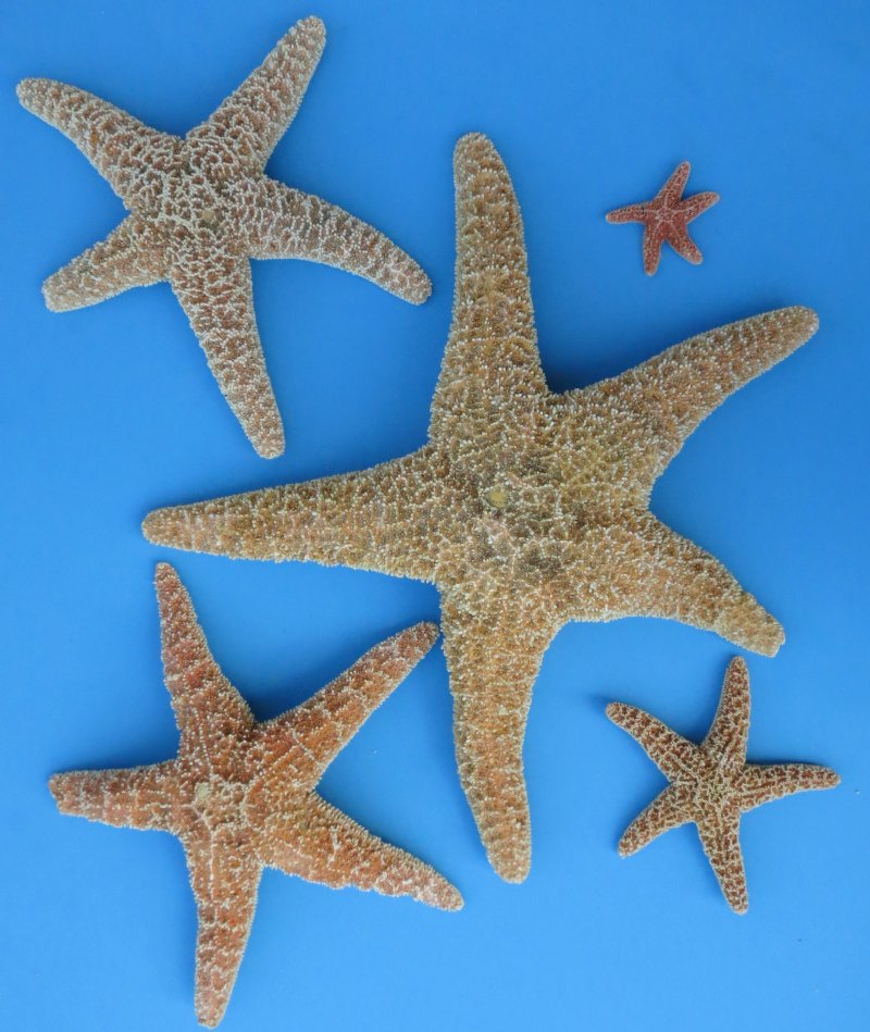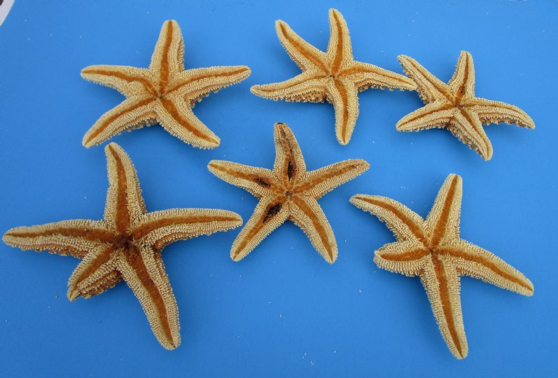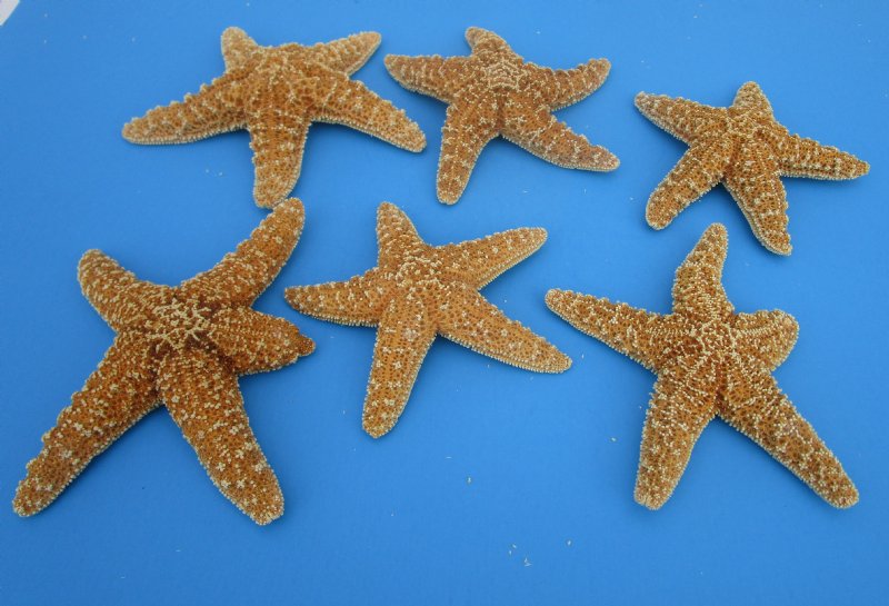 Box of 72 wholesale sugar starfish, also referred to as the common starfish measuring between 6 inches and 7-3/4 inches is one of the species of starfish most often used in starfish decor. These orange colored natural starfish called sugar starfish are placed on shelving in coastal home decorating, or made into Christmas tree toppers, or nailed to a wall as a room accent. The sugar starfish prefers cooler, coastal waters with bedrock, gravel, or coarse sand. It lives in both the deep depths of these waters and the shallow shores. This species can be seen in greater abundance with large mussel or barnacle populations.