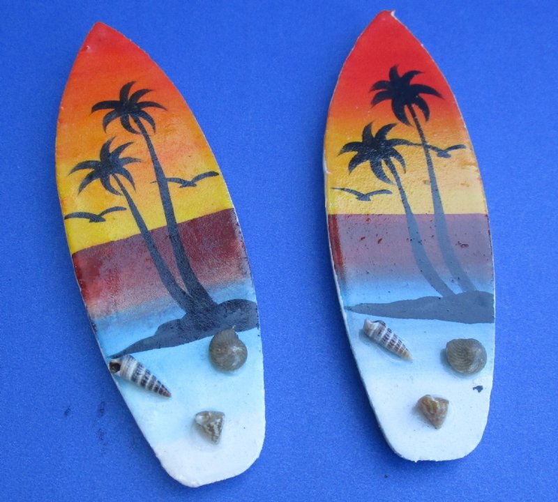 Wholesale Sunset Beach Scene Surf board magnet with seashells, 4 inches - 12 pcs @ $.75 each; 72 pcs @ $.67 each