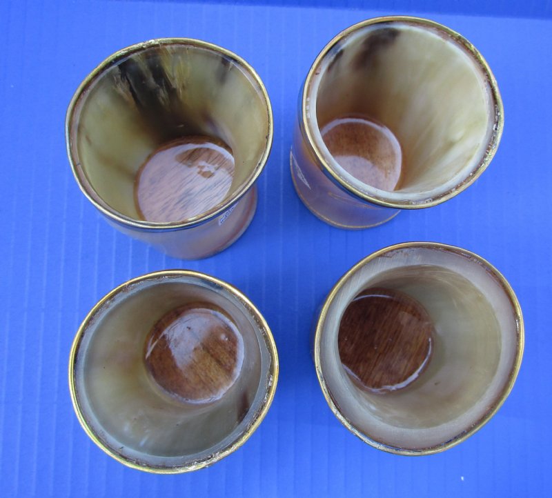 Wholesale Tan color Buffalo Viking Drinking Horn Shot Glass/cup with Brass Trim and Wood base - 3 inches tall - 2 pcs @ $7.75 each;