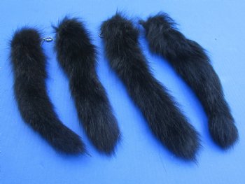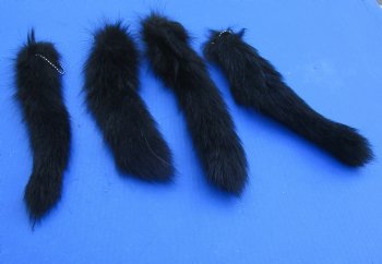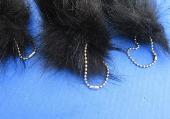 Wholesale Tanned Dyed Black Raccoon tails for sale, they measure between approximately 10 to 13 inches long with an attached ball chain. No 2 will be identical. These raccoon tails are from wild raccoon and will have imperfections that are normally found on all wild animals.