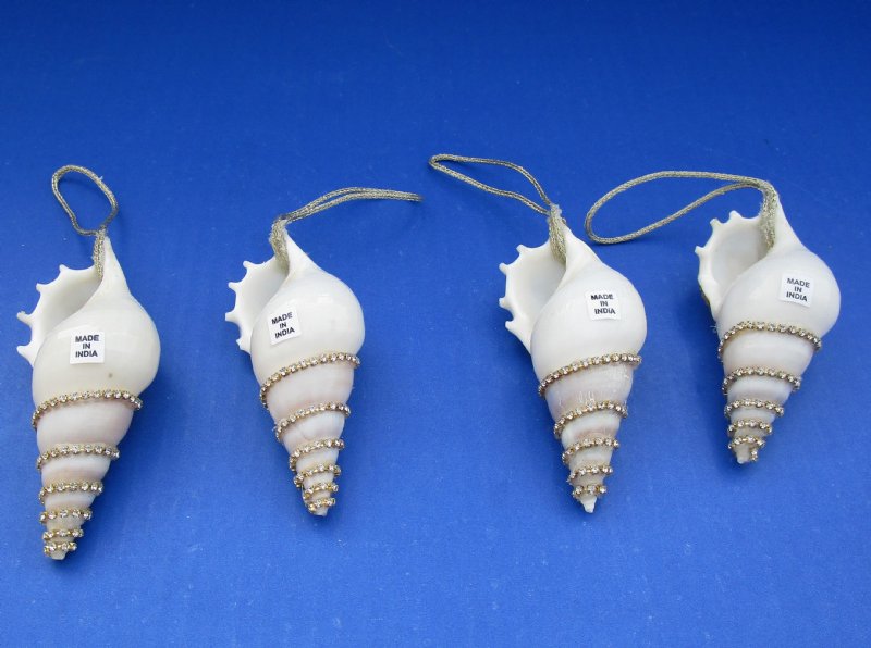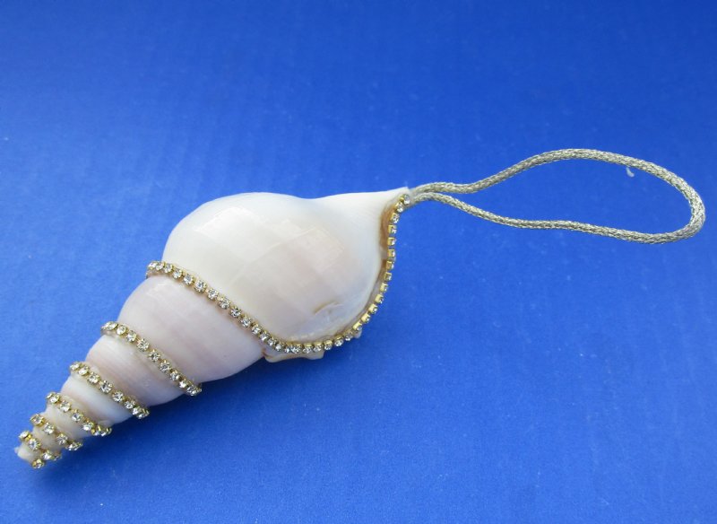 Wholesale Tibia shell ornament.  These ornaments are hand crafted and measure approximately 3 to 4 inches long (not counting the hanger). These tibia shell ornaments are made with a crystal rhinestone close chain in gold color wrapped around the shell with a gold colored hanger. Seashell ornaments are popular with collectors and shell ornaments sell year-round, are easy to transport, and are an inexpensive gift your customers can give to co-workers, neighbors, family, and friends. Whether you have a beach shops, Christmas shop or souvenir and gift shop our shell ornaments will be an item you cannot be without.
